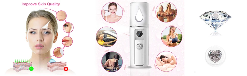 Handy Cool Mist Facial Mister adopted ultrasonic vibration technology and nano hydrating to moisturize skin deeply anytime anywhere. Facial or body hydration, sun skin repair, relieve for allergic skin, dry skin replenishment, adjust water and oil balance of the skin, cooling and sucking the pores after the closure of pores. Deeply moisturizing, improving skin conditions, make your skin soft and full of elasticity, prevents the signs of ageing.